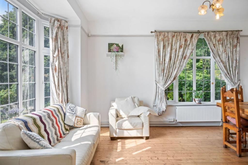 Drawing Room 6.60m x 4.34m. The drawing room benefits from its dual aspect which floods the space with natural light. An ornate open fireplace with a tiled hearth and surround serves as one of the room’s focal points, adding to its charm. The rooms features are further emphasised by the magnificent views from the beautiful bay window overlooking the Lee Valley and beyond, solid wood floors, antique door, bureau cabinet and intricate cornicing.
