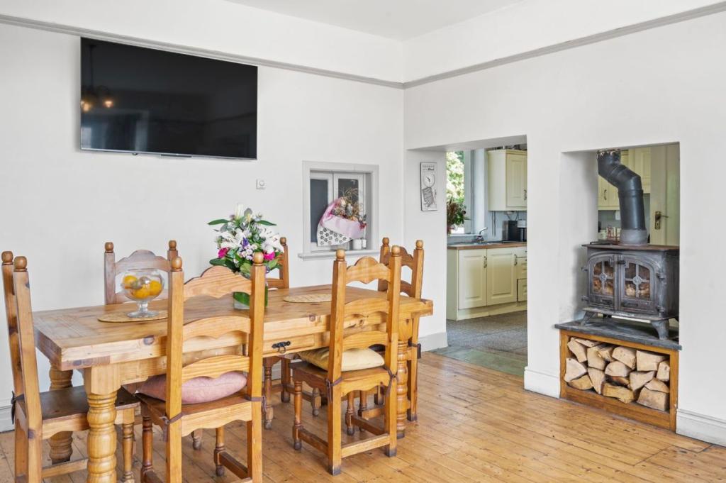Living Room 5.31m x 4.77m. The living room is a bright and airy space which features a raised solid fuel stove providing both warmth and a striking focal point. The room is dual aspect with a large bay window to the front offering stunning views of the valley and to the side offering views of the woodlands. There are wooden floors throughout.