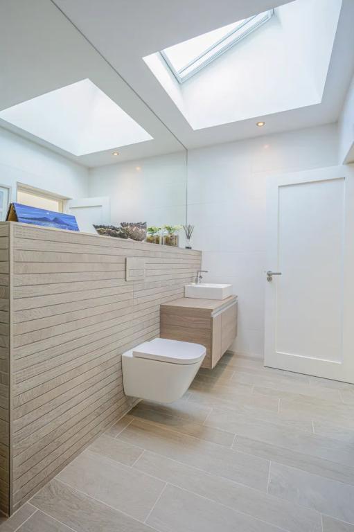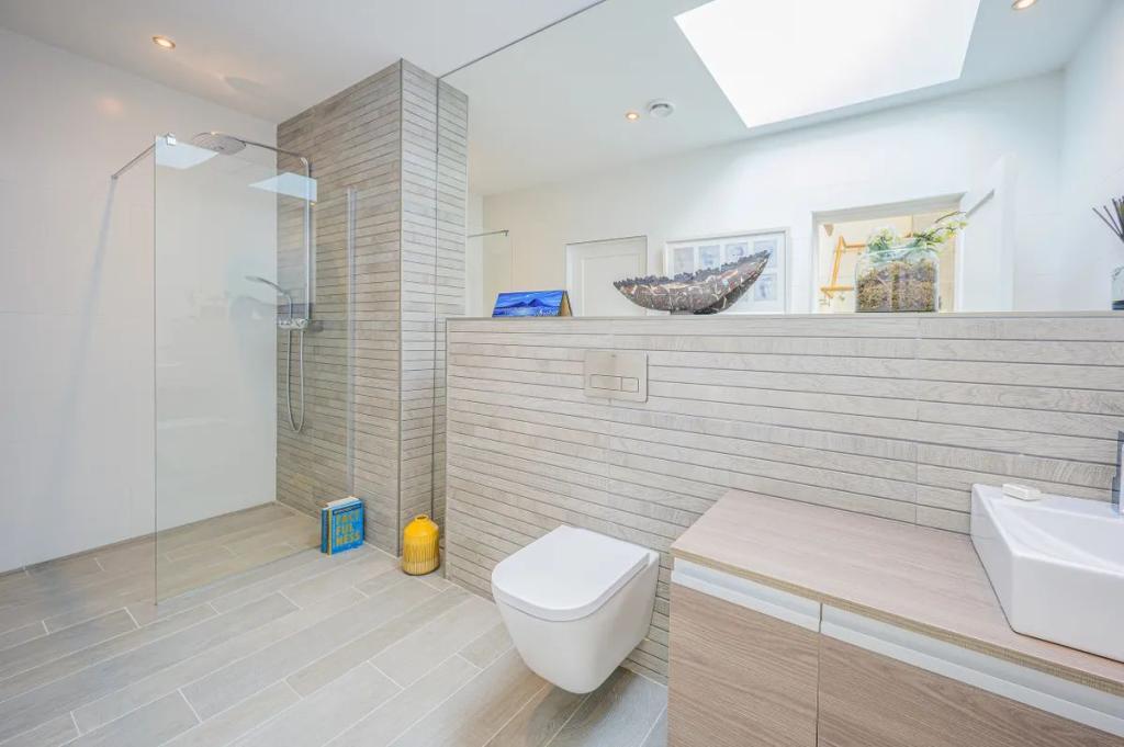 Guest WC 4.35m x 1.80m (14.27ft x 5.91ft) Fitted with Roca Bathroom suite and top of the range Grohe Massage shower with mutli-function jets which is ideal if the adjoining room is used as a gym. This wet room carries through the quality tiling and sanitary ware fitted throughout this home. Velux windows accessed remotely with sensors gives plenty of natural light and an extensive mirror enhances this room.