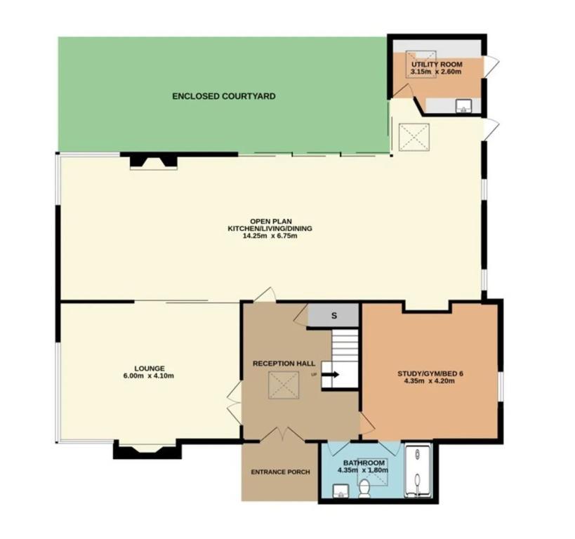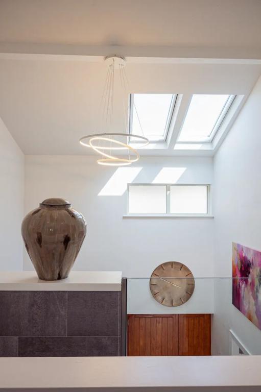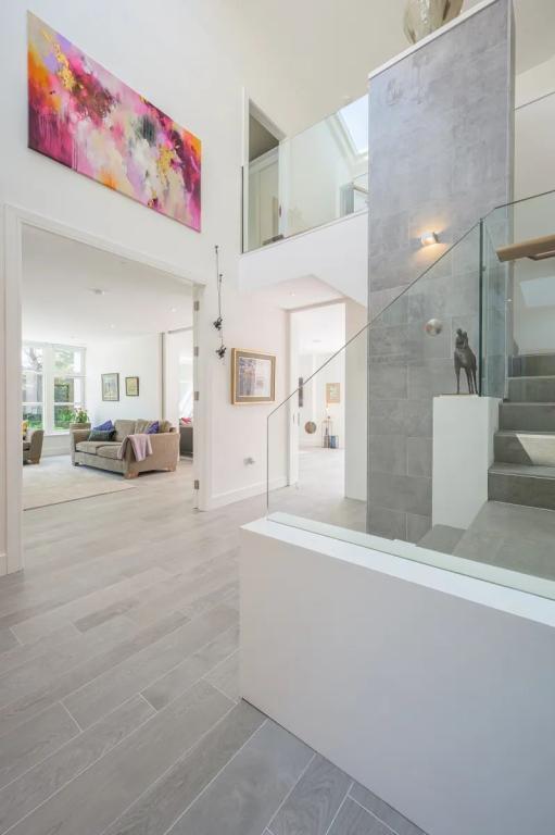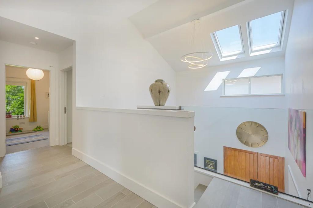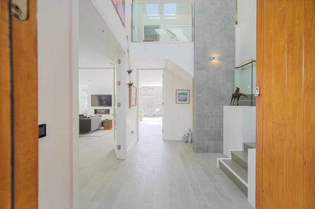 Entrance Hall 4.20m x 3.75m (13.78ft x 12.30ft) Welcoming entrance hall accessed via solid door of Accoya designed by South Wood this reception hall is exceptionally bright with an impressive ceiling height of 6.8m The use of gable windows together with sensor Velux assist in ensuring brightness is carried through. A feature light from light plan assists further.