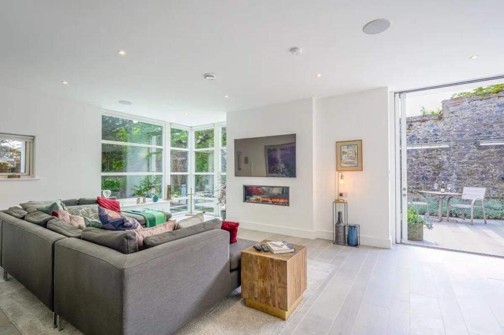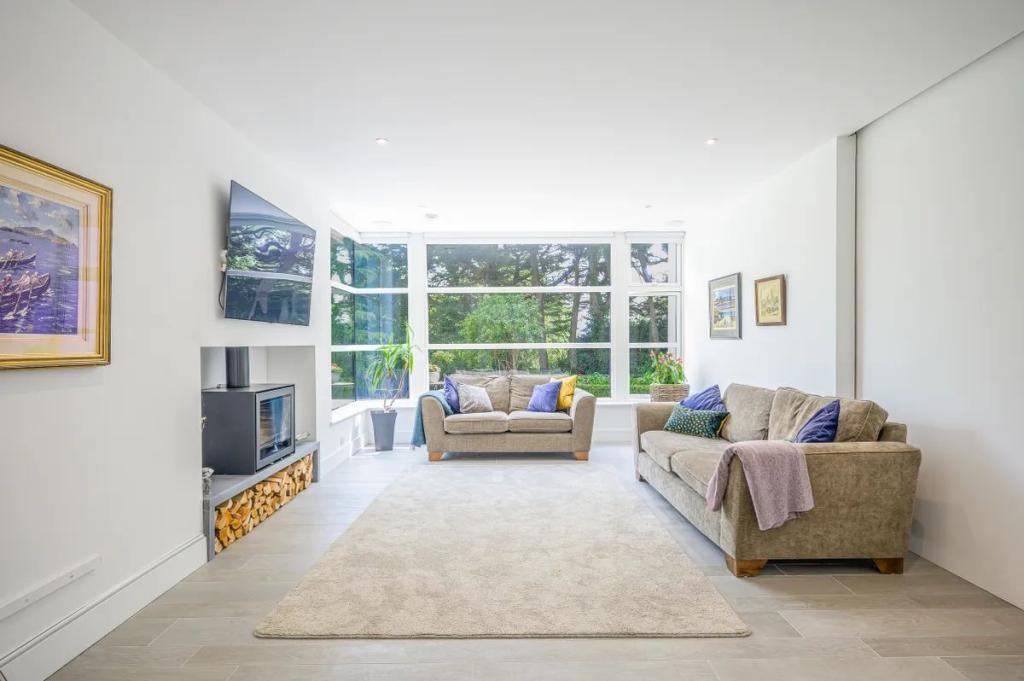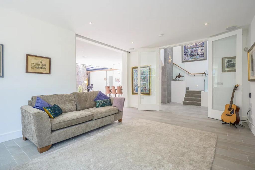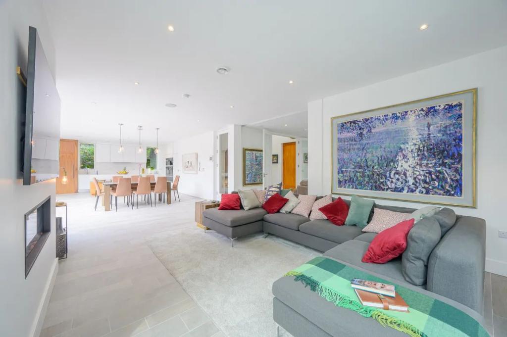 Library Area 6.00m x 4.60m (19.69ft x 15.09ft) The living room with its impressive size is arranged to look to the front of the property. Bespoke glazing without the interruption of large columns allows the eye to be carried to the mature backdrop of trees and planting. Arranged with an inset fire with the most up to date led technology for fire effect it is difficult not to think you are sitting in front of a real fire. The lighting here is on dimmable downlighters.