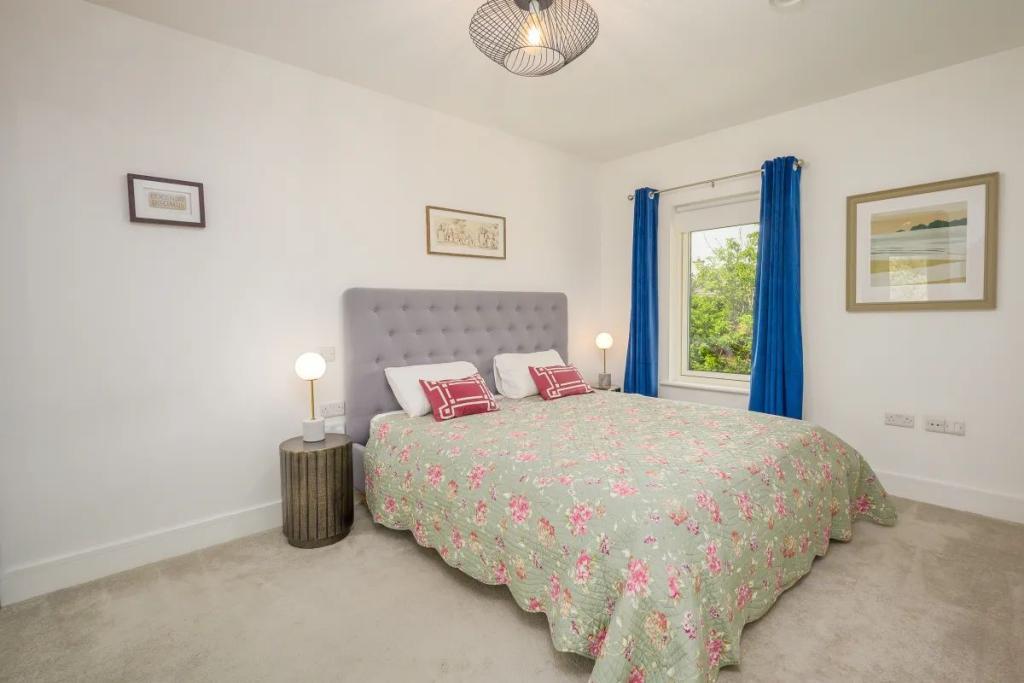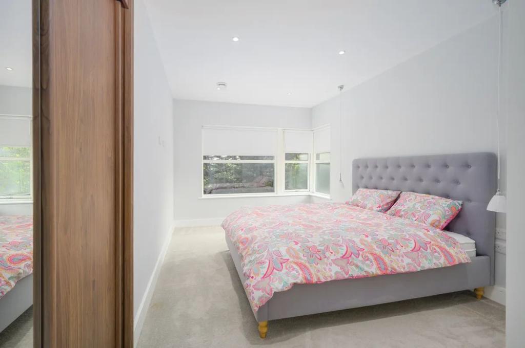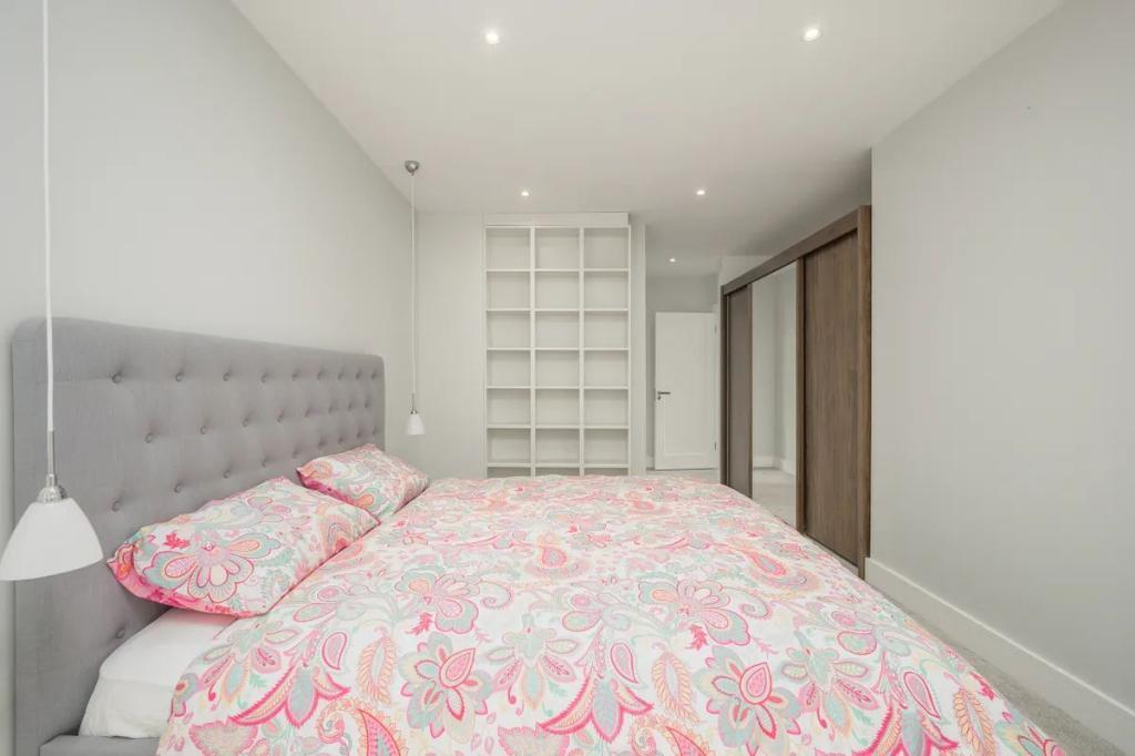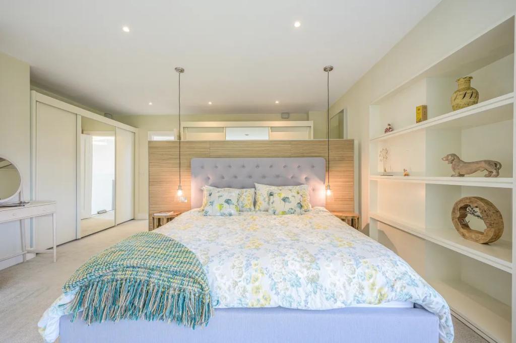 Main Bedroom 6.00m x 5.20m (19.69ft x 17.06ft) Entering this room, you really do feel you are up in the canopy of mature trees located to the front of this home and looking out all you can see is nature. An exceptionally large master bedroom with customised robes to give a walk-in wardrobe together with additional bespoke shelving. Extra storage is catered for in a second run of wall-to-wall robes. The bed, set against a backdrop of Porcelanosa tiles in the Starwood range brings a softness to the room and is wired with downlighters and usb ports either side. The design of the extensive glazing giving dual aspect fitted with electric blinds is used to form display shelves within the room ensuring the horizonal lines are kept. Recessed lighting finished in neutral tones with carpet floor.