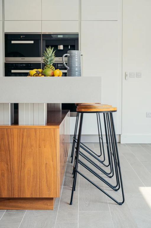 Kitchen 6.75m x 3.40m (22.15ft x 11.15ft) A meticulously well-planned room giving three distinctive spaces yet all marrying well to be read as one. The kitchen is bespoke by Ger Hallissey in two tone with a mixture of materials using walnut blended with white gloss and offers under counter units to a walk-in larder. There is a myriad of storage offering clean lines and seamlessly incorporating all of the functions required. The decision to create a kitchen without the interruption of handles ensures the eye is taken to the entire space as opposed to focusing on one element. Miele appliances are standard from induction hob, double oven, steaming oven, warming drawers and coffee machine. Integrated dishwasher and deep sink with Ghroe mixer tap. A Falmac extractor over the hob can discreetly push back once cooking is over. One of the true winning features within the kitchen is the extra-large breakfast counter. Measuring an impressive 1200 x 2400mm the breakfast counter is bespoke designed to fit the space perfectly and has a unique feature fitted within, motorised lifting columns which with, its ergonomics in adjustable heights allows the entire counter to alter in height depending on its use. The breakfast counter with sockets within is topped with Silestone (NIEBLA) with a complimenting Silestone finish on the counter tops. The work top area is orientated towards the rear garden and the clever placement of two picture windows gives a vista of the mature 85 year old apple tree. The walk-in larder by South Wood opens fully with automatic lights and when opened gives a definition to the end of the kitchen. With recess lights by Saxby and glazed door to rear garden.