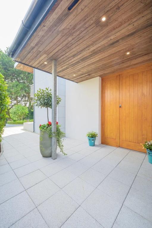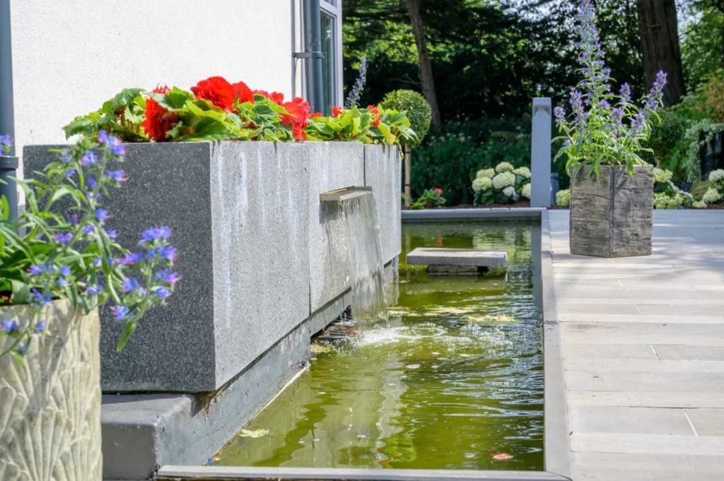 Outside : The courtyard while classed as outside space is more akin to an extra internal room. Accessed directly from the open plan kitchen/dining/living space this courtyard is permanently in use. It has been created against the orchard wall for shelter and the use of electric canopy as well as alfresco heaters assists. A bespoke water feature gives that extra layer to the relaxed feeling in this space. The balance of the outside space surrounding this this home has been designed so that the house itself settles perfectly within the maturity of its planted landscape.