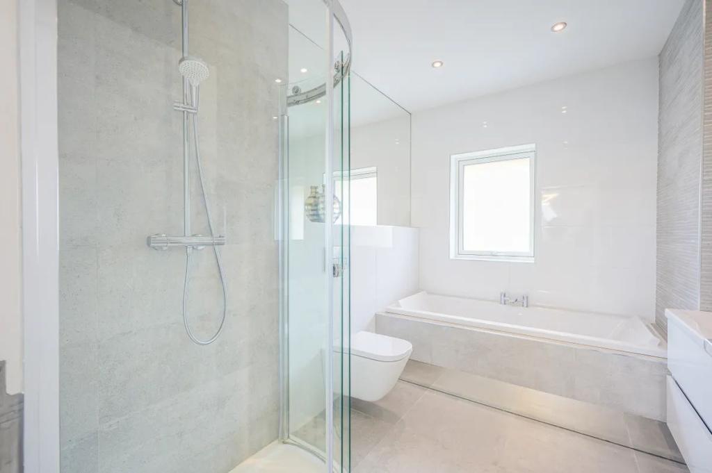 En-suite 3.35m x 2.60m (10.99ft x 8.53ft) A beautifully tiled four-piece suite and finished in Starwood Nebraska ice coffee tiles complemented with the use of crystal white on the walls. Sanitary ware if from the Roca range and flova shower head with ghroe fittings. Wash hand basin fitted with storage beneath and a large upstand mirror. Wall hung wc and heated towel rail.