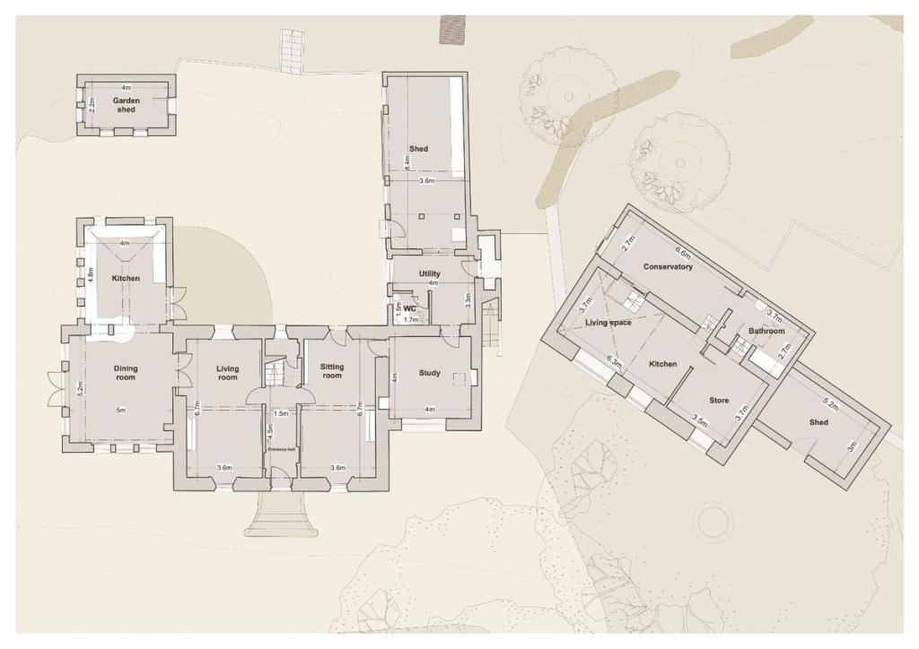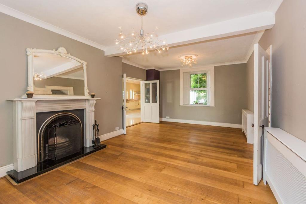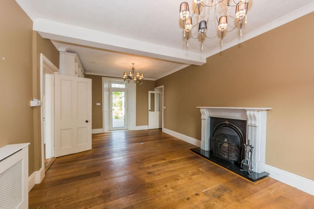 Inside the home a grand entrance hall leads on one side to the original part of the building with traditional features such as sash windows and shutters. The reception rooms benefit from high ceilings and open fireplaces. The formal sitting room also benefits from access to the outdoors via a door on the west wall. Onwards to a generous light filled study with a large east facing window. Behind the study is a utility and WC area leading on further to a storage area and large workshop. On the other side of the entrance hall is the newer addition, a light filled modern extension with a large open plan kitchen and dining area, again with access to the front and rear garden.
