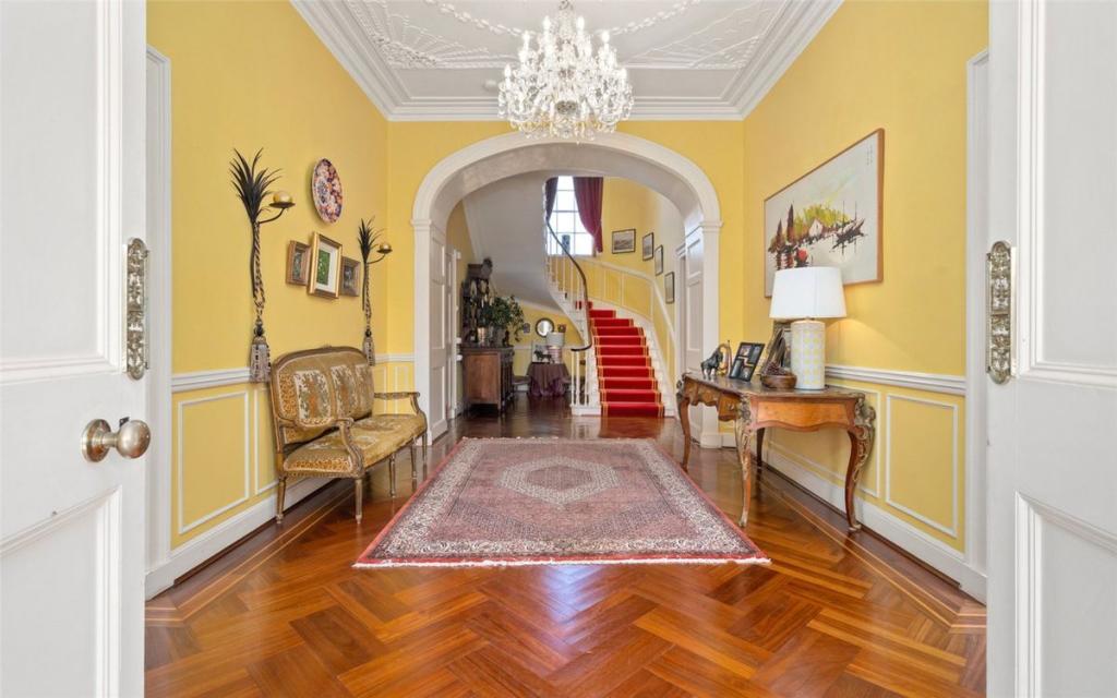 Making your way up the gradually ascending driveway passing a c.500-year-old Oak tree, you are guided up the enchanting driveway which is bounded by a collection of post and rail paddocks and mature spruce pine trees. As Waterloo House comes into view, you get the sense that you are approaching a very special property. The driveway offers ample parking to the front or indeed via the rear archway to the first stable yard. Making your way up the limestone steps and stepping over the threshold via the solid wood door with overhead fanlight, you are greeted by a welcoming and hugely impressive reception area with 11' 2" high ceilings. Her, you will find original plasterwork and cornicing and the original pitch pine staircase which brings you to the first floor via its gradually ascending steps.