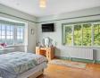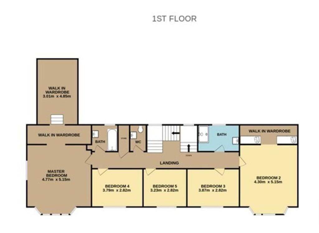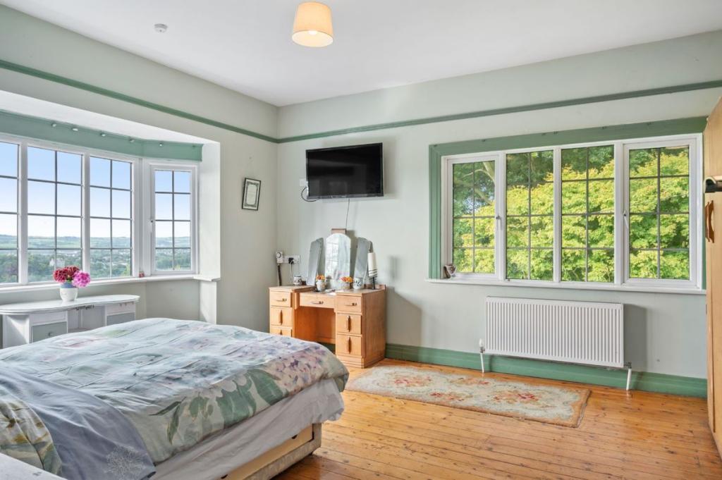 Master Bedroom 5.15m x 4.77m. The master bedroom is both bright and spacious with large windows framing stunning views to the south and west. The room also has the additional benefit of a large walk in wardrobe providing ample storage and features solid wood flooring throughout.