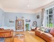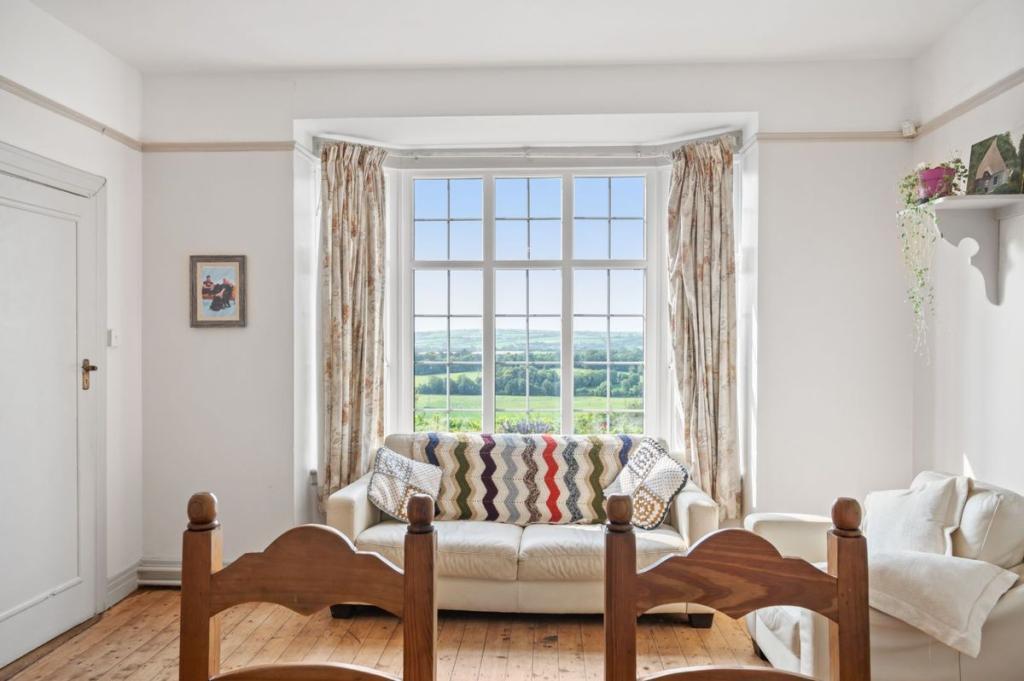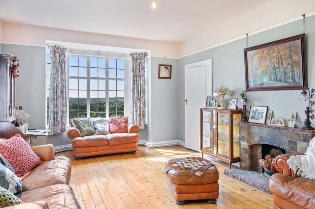 Living Room 5.31m x 4.77m. The living room is a bright and airy space which features a raised solid fuel stove providing both warmth and a striking focal point. The room is dual aspect with a large bay window to the front offering stunning views of the valley and to the side offering views of the woodlands. There are wooden floors throughout.