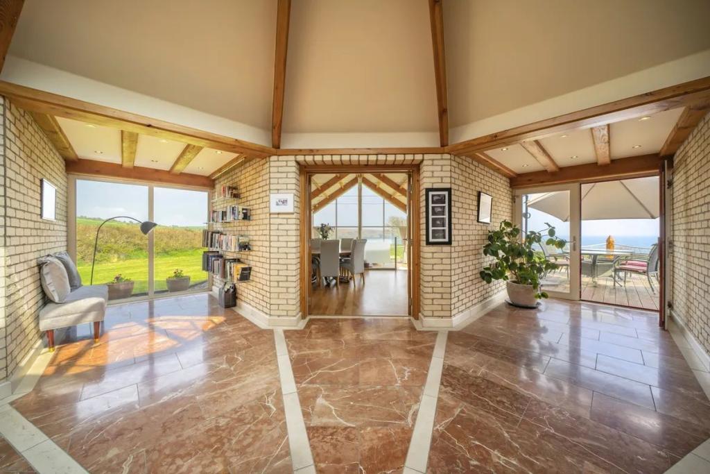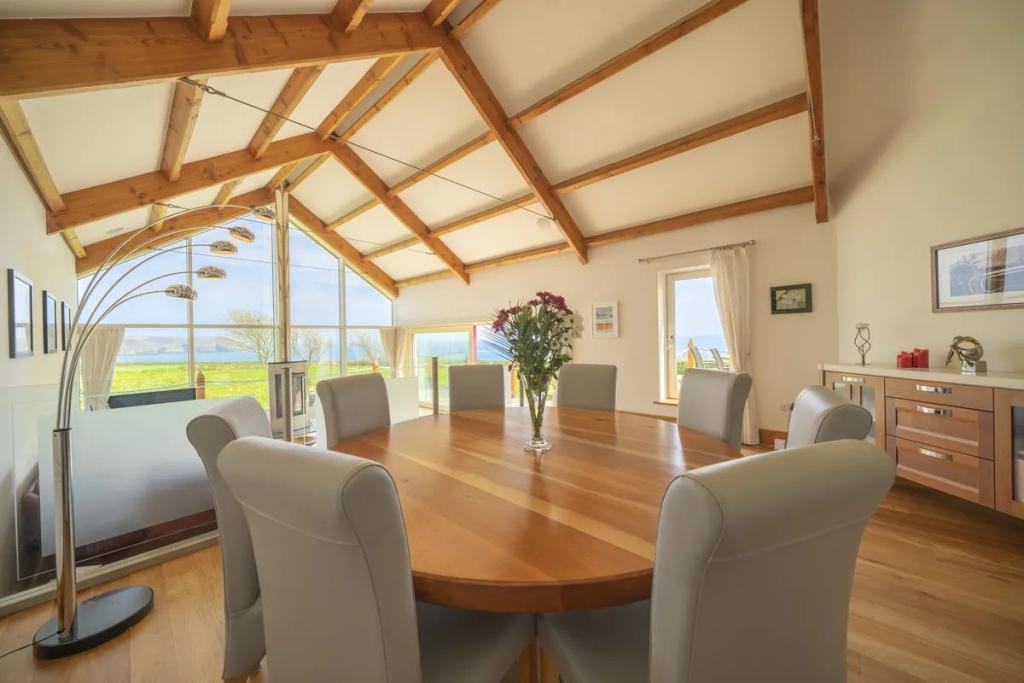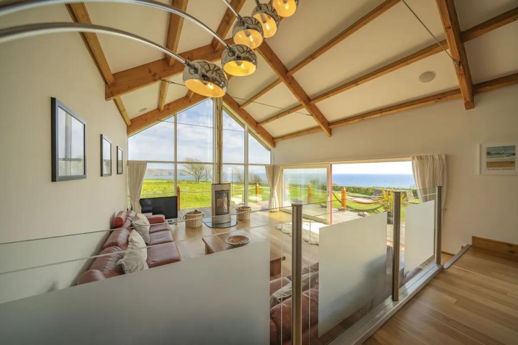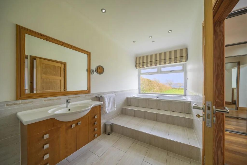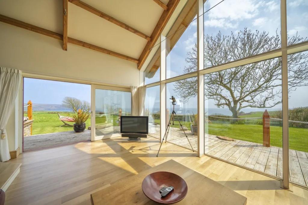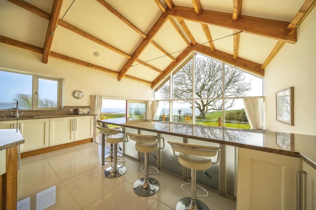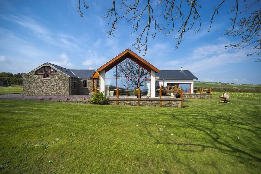 This unique star shaped home offers a rare opportunity to acquire a stunning coastal home finished to an exacting standard with beautiful uninterrupted sea and countryside views. Located on a mature site at the end of a quiet cul-de-sac the property features outstanding privacy and direct access to a secluded beach for swimming and kayaking.