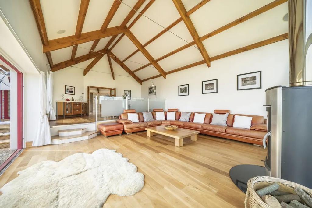 On a living area of 300 sqm the house offers a large living cum dining room, a fine kitchen with adjacent lounge together with four bedrooms and four bathrooms. One arrives at the octagon shaped hallway with vaulted ceiling and domed centre light. From there four wings lead to the living and reception areas, the master suite wing and the sleeping quarters. The home benefits from double height vaulted ceilings in all living areas and the master bedroom and glass gables in the living room and lounge overlooking the sea and the gardens. A large patio wraps around the lounge, living room and hallway with various access points through sliding and French doors. The kitchen offers fully fitted units with granite work tops and integrated appliances. The master bedroom has fine walk-in wardrobes and a beautiful en-suite with a jacuzzi bath overlooking the sea. There are a further three bedrooms, two of which have shower rooms en-suite, and a family bathroom. On the top floor there are converted attic rooms, one presently being used as an office overlooking the sea. The large site of 1.1 acres is partly landscaped and also has a large lawn and wild flower meadow. The site has plenty of parking and a double garage.