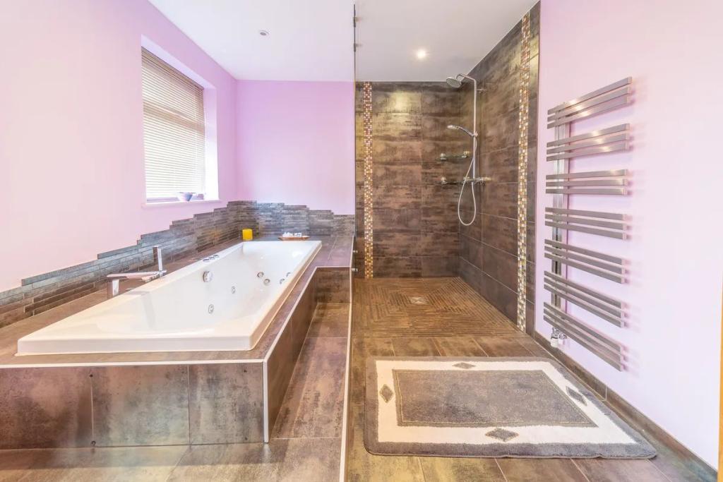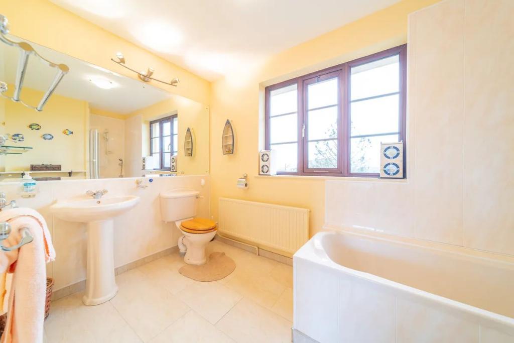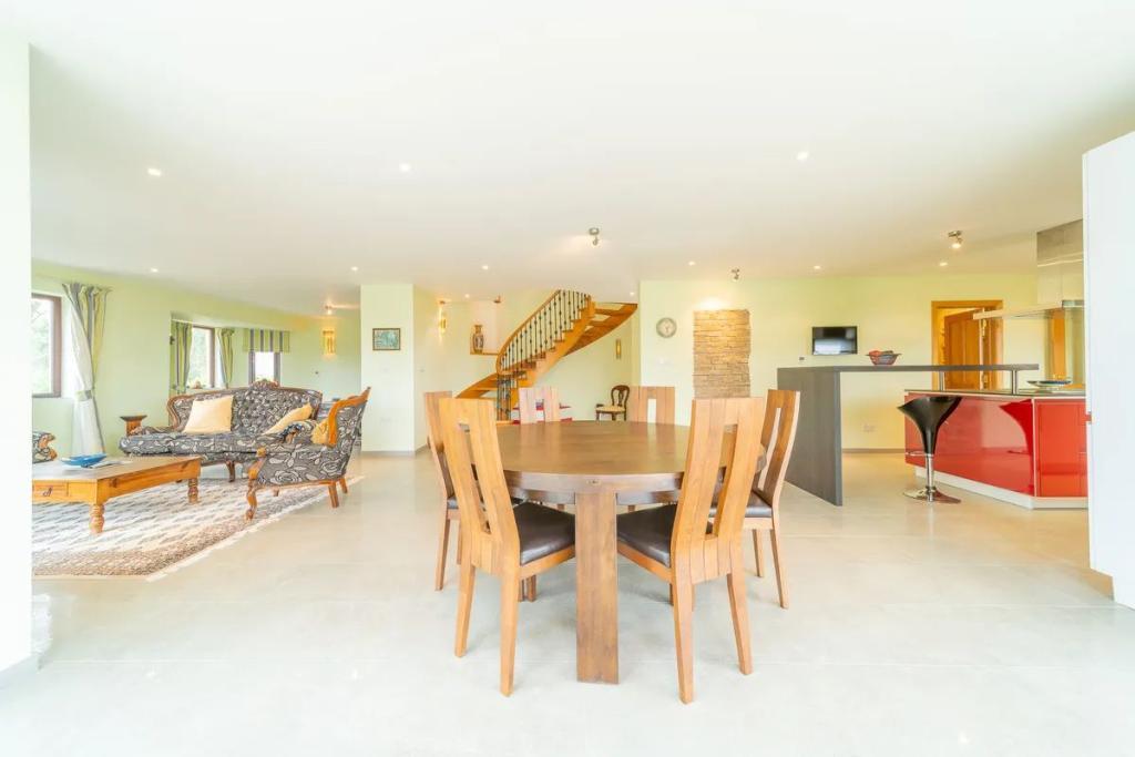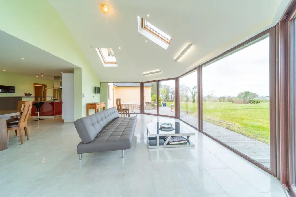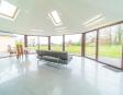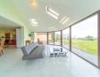 The large open plan conservatory area flows on to the dining room and living room with a wood pellet solid fuel stove providing heating for this area.