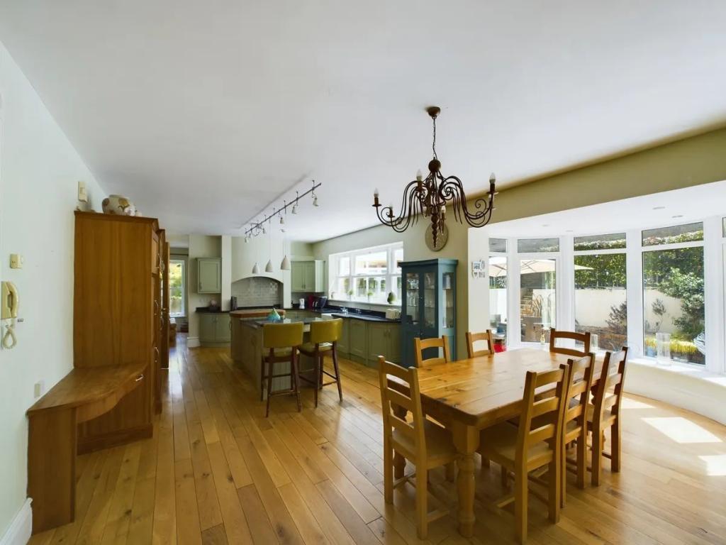 Kitchen/Dining Area (4.54m x 8.76m) Wood flooring. Floor & eye level fitted units with feature breakfast island, integrated appliances and dining area with bay window.
