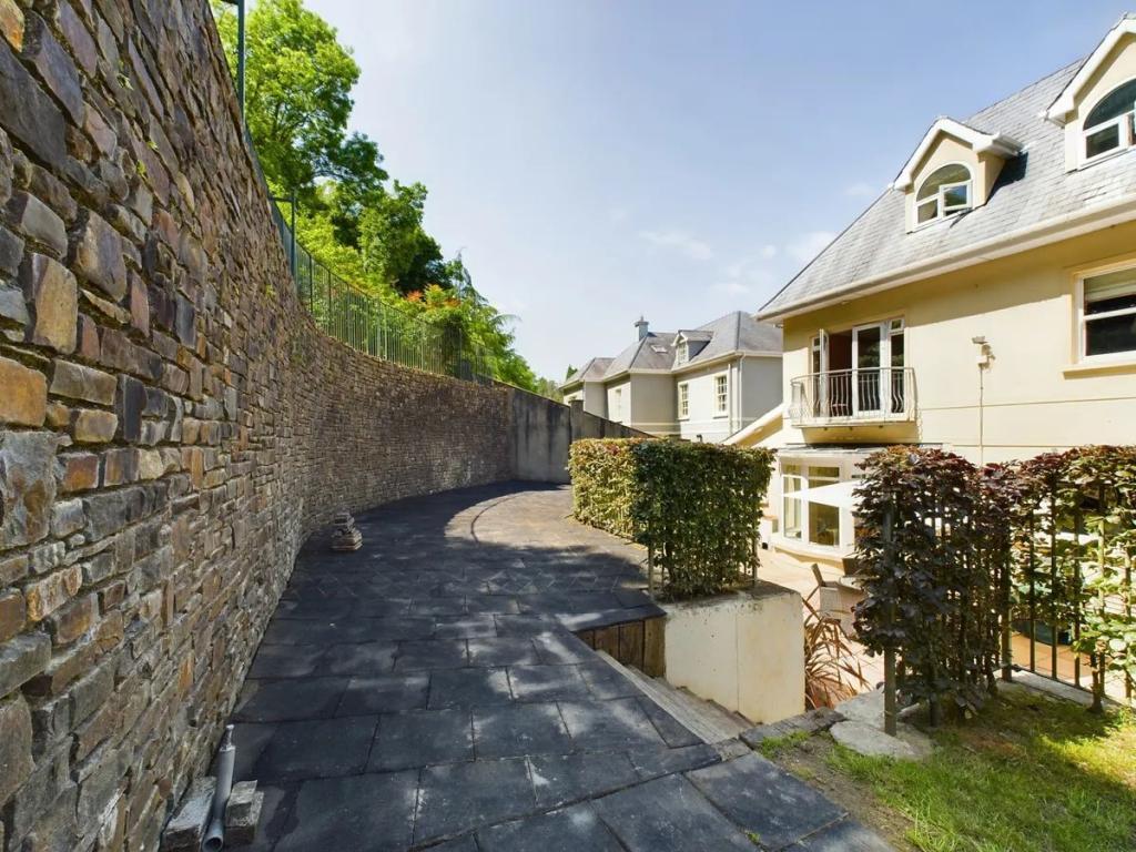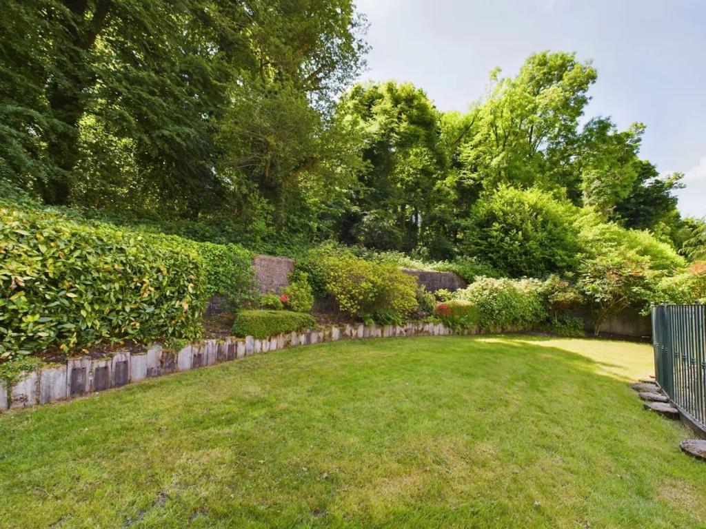 Patio area to the rear with garden split across 3 levels connected by steps. Top level provide a stunning view of the house and has a railing across.